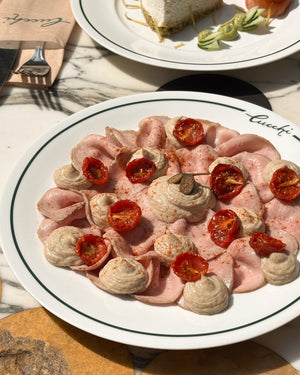 Tazzina da caffè con piattino in porcellana bianca, filo verde lungo i bordi e l'iconico marchio della Pasticceria Cucchi, a... Scopri di più